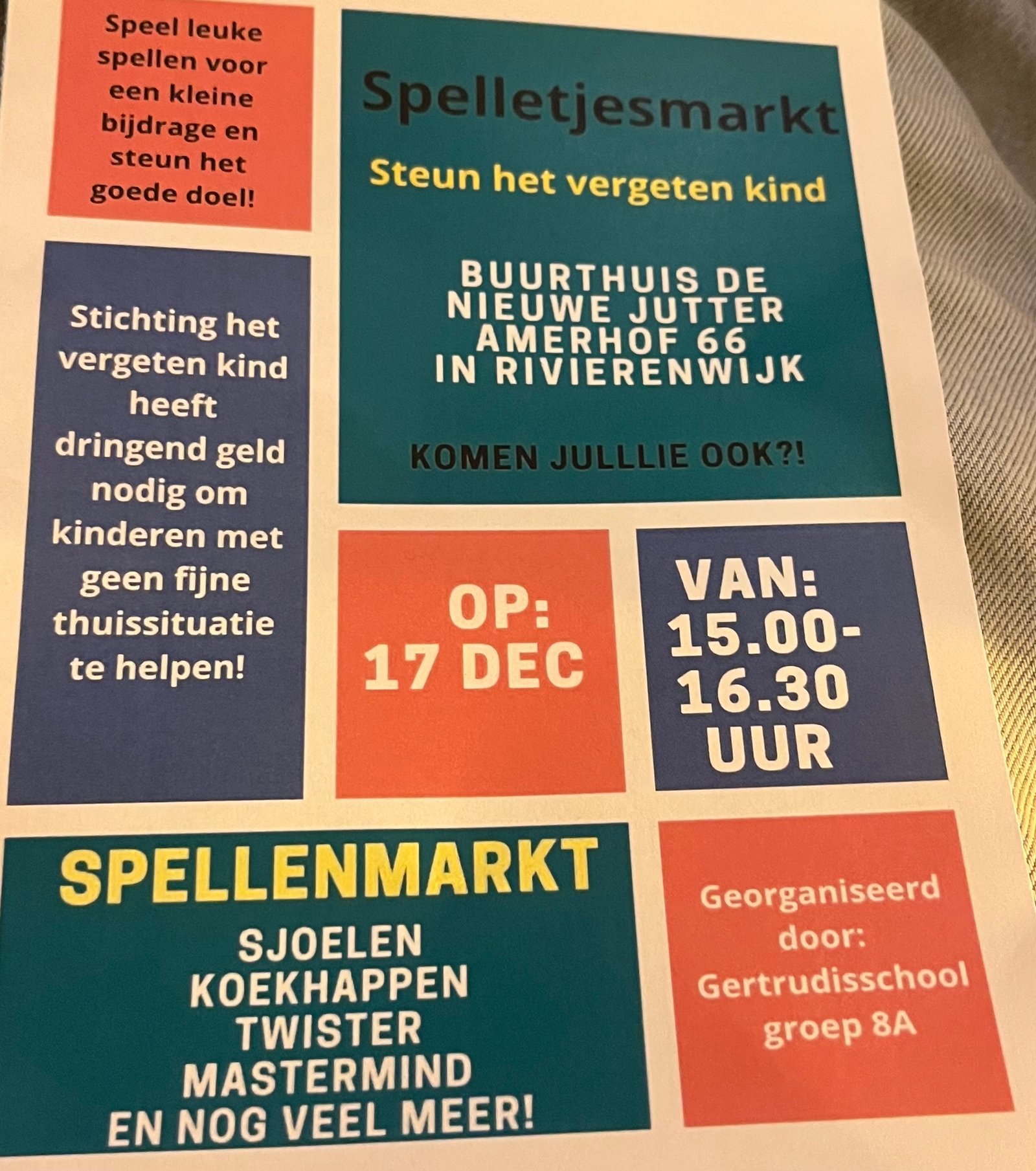 Door groep 8A Getrudisschool 17 december 15:00-16:30 Op dinsdag 17 december organiseerden leerlingen van Gertrudisschool groep 8A een gezellige spelletjesmarkt…